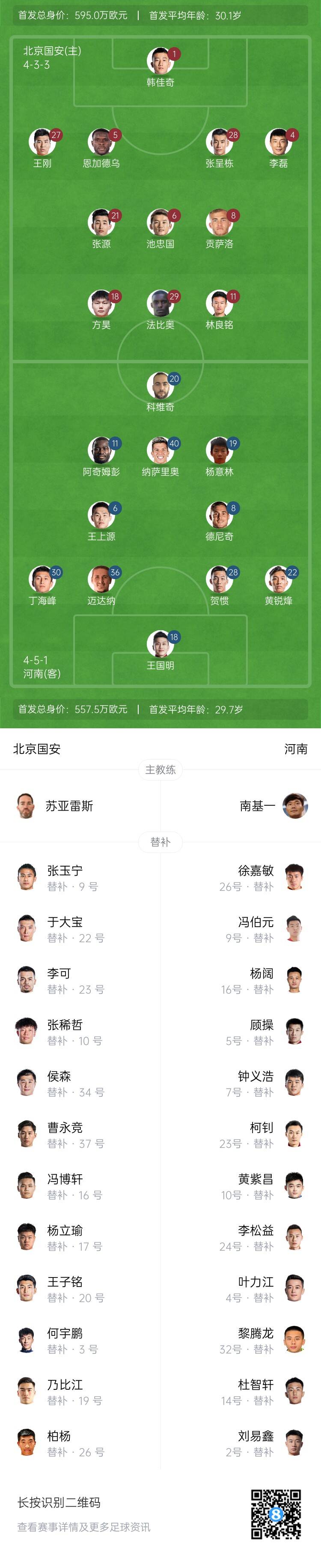 中超前29轮,国安取得16胜7平6负的战绩,积55分排在中超第4名且已经锁定第4,本场比赛不会对排名有影响。河南队现在是9胜8平12负积35分排在中超第8,球队无欲无求。