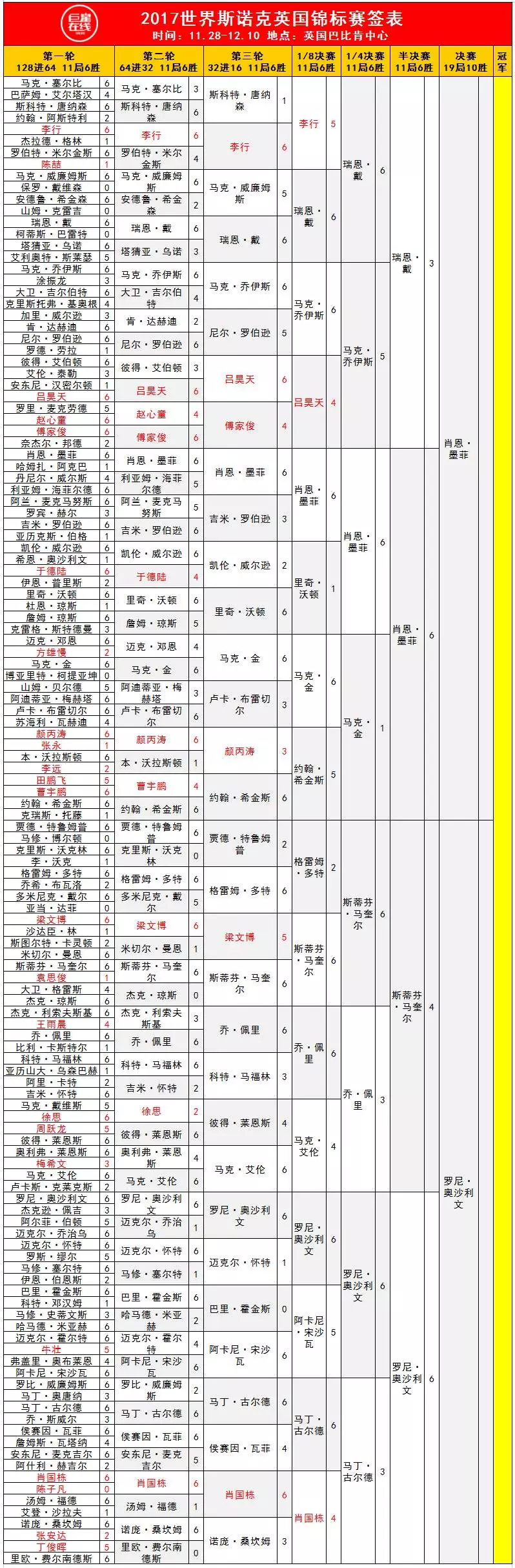 2017 斯诺克英锦赛各场 比赛 ?2017英锦赛半赛打15局。中国台球协会官网讯2017斯诺克英锦赛决赛,奥沙利文和墨菲联手奉献了一场堪称经典的对攻大战。奥沙利文轰出3杆破百及7杆50+,墨菲也有...