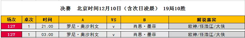 英锦赛决赛将分为两个时段进行,分别为北京时间今天21时和凌晨3时,决赛采用19局10胜制。