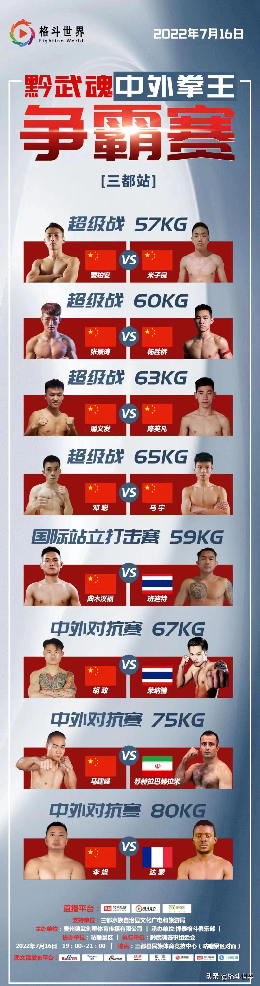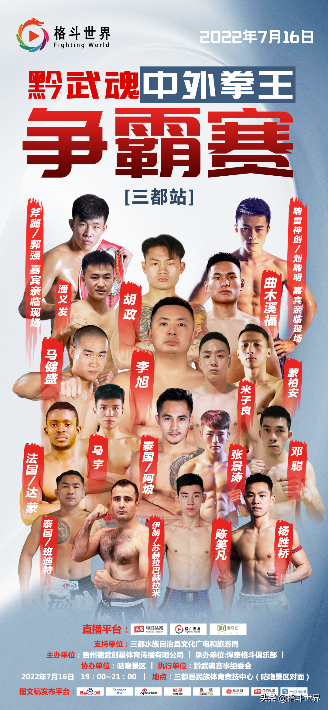 2022年7月16日,2022《黔武魂》中外拳王争霸赛-三都站将在贵州省三都县民族体育竞技中心激情打响,本次赛事由贵州德武创新体育传播有限公司主办,贵州悍泰格斗俱乐部承办,并得到了贵州省三都水族自治县文化广电和旅游局的大力支持。