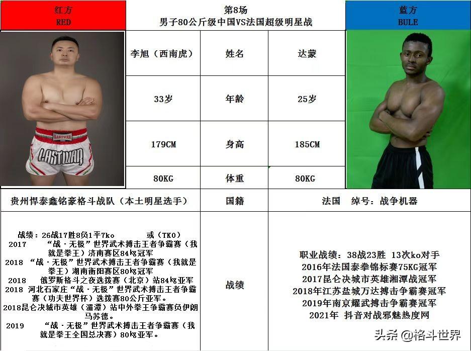 本次比赛,李旭将与来自法国的25岁年轻拳手“战争机器”达蒙,迎来一场80公斤级的自由搏击规则超级战。身高185cm,体重80kg的达蒙,获得过2016年法国泰拳锦标赛75kg冠军,职业战绩38战23胜13KO,相比于李旭而言,拥有着6cm的身高优势和8岁的年龄优势,这场比赛,老将李旭能否再展雄风,击溃年轻的法国泰拳冠军达蒙呢?