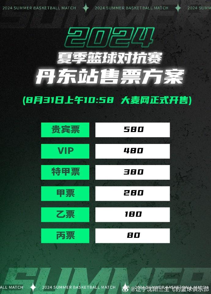 据辽宁沈阳三生飞豹篮球俱乐部官方社媒平台消息,“宽甸文旅杯”2024夏季篮球对抗赛(丹东站)比赛门票31日10时58分大麦网开售。