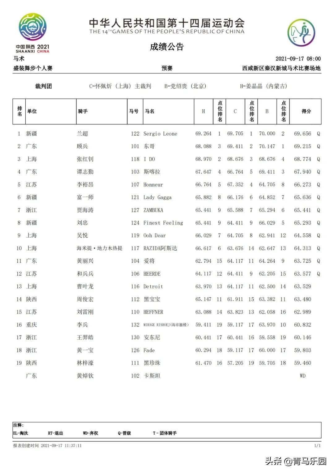 ▲第十四届全运会马术项目盛装舞步个人赛预赛成绩公告。图源:十四运官网