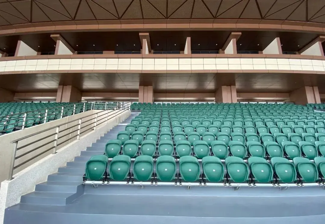 马术主赛场主要进行场地障碍赛和盛装舞步项目的比赛。看似普通的地面,马术场地的沙子不同于普通的沙子,而是由织物、纤维和一定比例的石英砂混合而成的纤维砂,在避免扬尘的同时,也能起到保护马匹的作用。