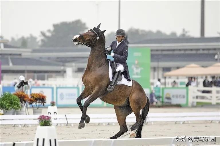 ▲9月16日,在西咸新区秦汉新城举行的十四运会马术盛装舞步团体赛暨个人资格赛上,广东队的黄焯钦与爱驹“卡斯坦”表演斜横步空中换腿动作。图源:陕西日报