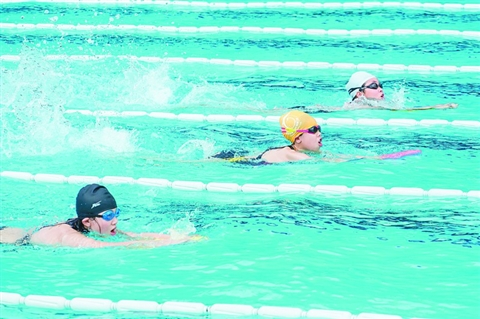 儿童组乙组女子100米自由泳腿比赛中,小选手们奋力游泳。/佛山日报记者王澍摄