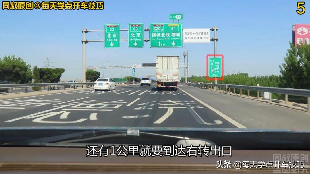还有1公里就要到达右转出口,此时,无论左侧车道是否有车辆,都不要进行变道超车操作了,在右侧车道保持距离跟行在前车后面,等待右转出口的出现。在这个路段行驶中,地面不断出现震荡线,这就是提示行径此处的车辆:前方复杂路段,注意车速、车距,谨慎驾驶。特别是对于那些准备去往右转方向的车辆,请注意方向识别,及早进入右侧车道做好右转准备。