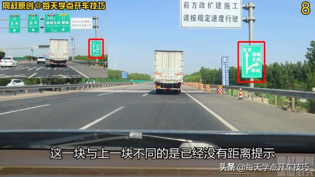 右侧再次出现一块导向标牌,这一块与上一块不同的是已经没有距离提示,那说明即将到达分叉口了。在接下来到达分叉口这一段落,最常见的就是被加塞,加塞车辆分两种情况:一种是没有注意右转标志提示,也没有听清楚导航提示,临近右转出口才发现,于是紧急向右变道加塞;另外一种情况是故意而为之,就是为了抢先一步,临到右转出口之前还继续超车,最后只能加塞进来,这种情况属于开车人品问题。以上无论哪种情况,临到右转出口前临时变道都极其容易发生交通事故,被追尾的话自己还要承担全部责任。