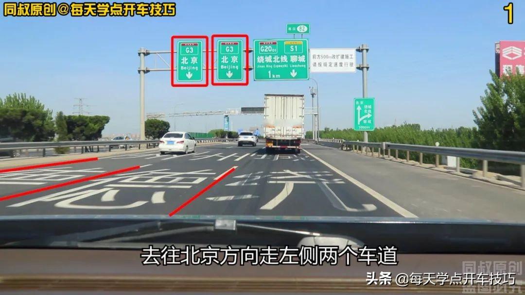 这是一条比较繁忙的三车道高速公路,上方车道指示标牌显示:去往北京方向走左侧两个车道,去往绕城北线和聊城方向走右侧车道。