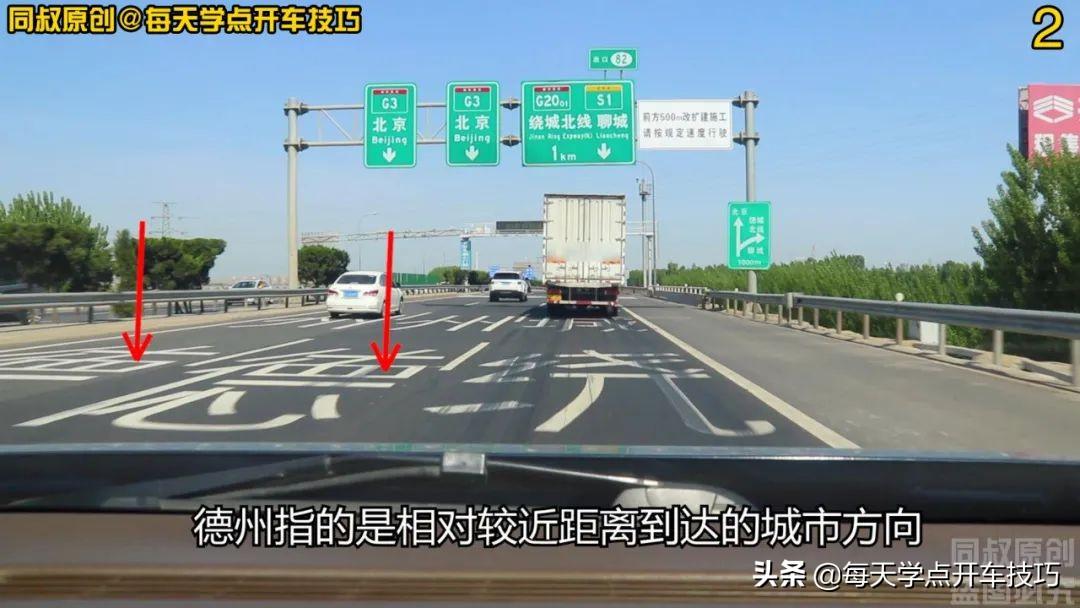 地面车道内也有大型字体提示,该车道去往的方向,左侧两车道内的字体是“德州”二字,这个与上方车道指示标牌写的“北京”方向并不矛盾。北京方向指的是本条高速最终到达的方向,德州指的是相对较近距离到达的城市方向。
