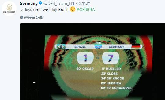 德国将于3月28日与巴西进行一场友谊赛,目前距离友谊赛开始还剩下17天。对此,德国队官推在推特上写道,“距离我们踢巴西还有...天”,并在底下附上一张巴西1-7德国的比赛截图。
