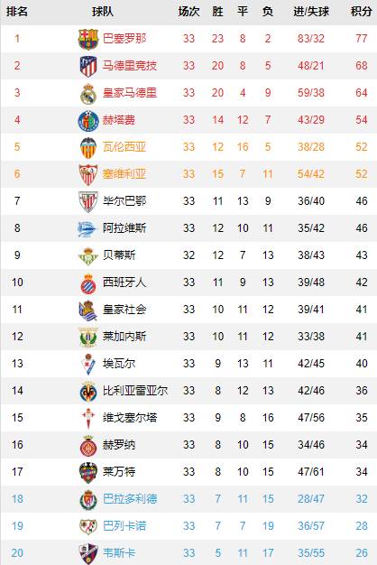 巴萨以77分高居榜首,马竞积68分位列次席,皇马积64分排名第三,赫塔菲、瓦伦西亚和塞维利亚分列四到六位。