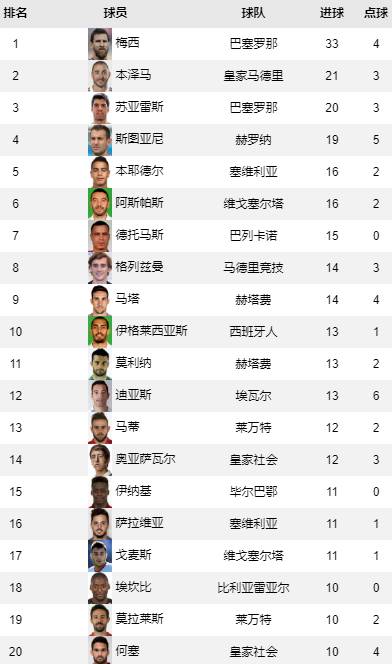 梅西33球领跑射手榜,本泽马打进21球排名第二,苏亚雷斯斩获20粒进球,斯图亚尼则有19球入账。
