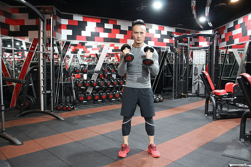 (1)双脚约与肩同宽,双手握住哑铃,举起至胸前位置。