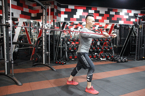 (1)弹力带固定好,采弓箭步,将弹力带举至胸前,双手握好往前推,注意手肘不锁死,稍微停顿后再慢慢回放,重复动作。