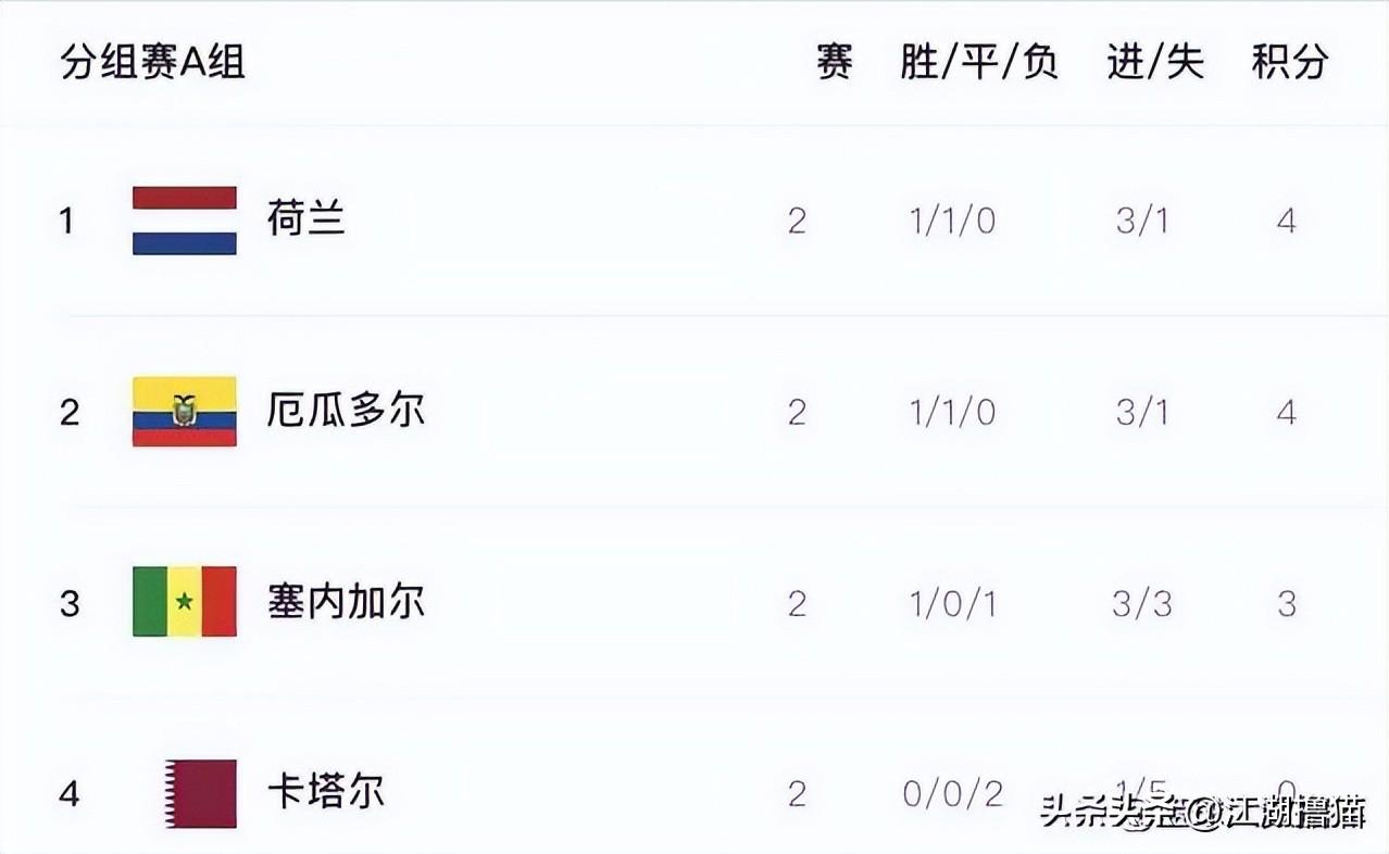目前荷兰队1胜1平积4分,打入3球丢1球与厄瓜多尔并列小组第一,最后一轮只要打平就能确保出线。