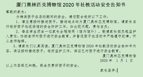 (2)请家长仔细阅读并同意《厦门奥林匹克博物馆2020年社教活动安全告知书》再报名参加活动,并于活动当天进馆前,在博物馆前台缴费、签到。