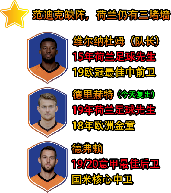 荷兰首发:1-斯特克伦博格、3-德里赫特、6-德弗里、12-范安霍尔特、17-布林德、22-邓弗里斯、8-维纳尔杜姆、15-德容恩、21-弗兰基-德容、10-德佩、19-韦霍斯特
