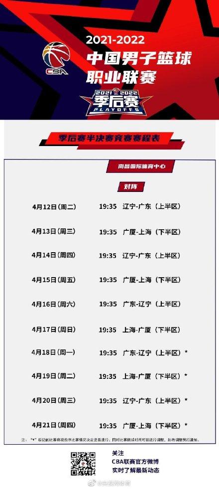 CBA官方赛程显示,今年半决赛提前一天进行,首战将于12日19:35举行,对阵双方是辽宁和广东。而13日19:35,广厦和上海将迎来对决。