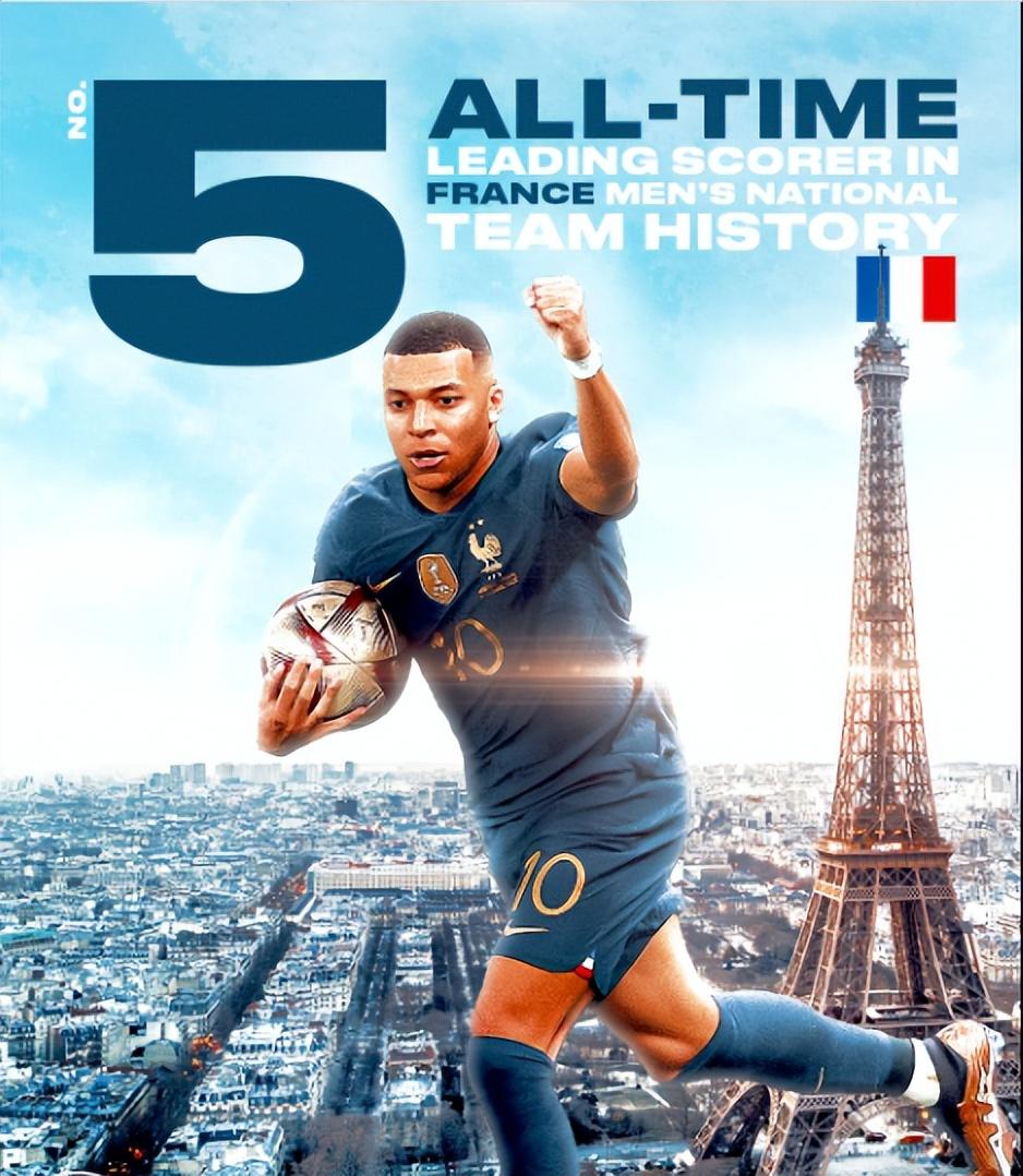 24岁的姆巴佩在首次正式担任法国队长的比赛中打进了两球,他的国家队进球数上升至38球,超越了前辈本泽马,上升至队史射手榜第5位,仅次于吉鲁、亨利、格列兹曼和普拉蒂尼的存在。