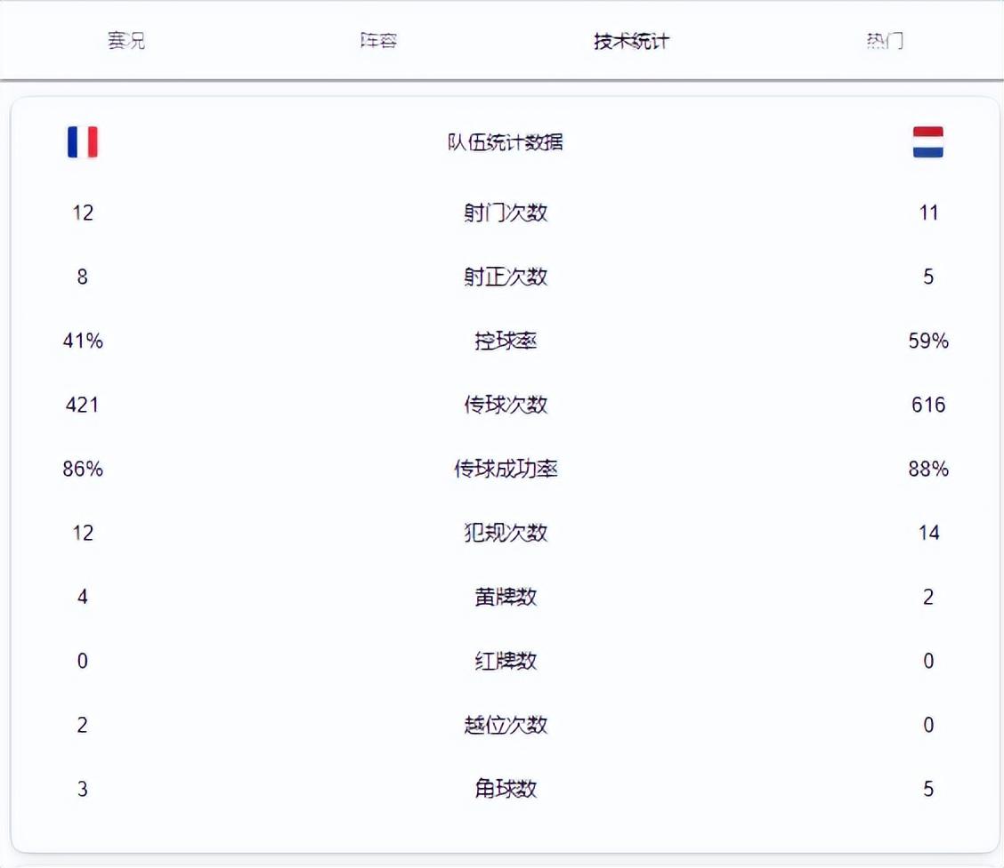 此后,双方都无法再次改写比分,最终法国4-0大胜荷兰。