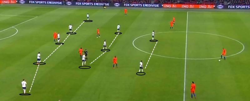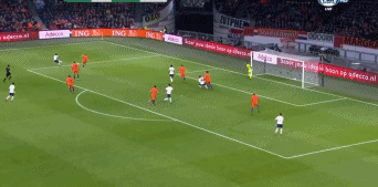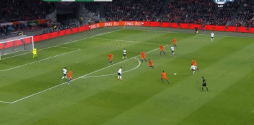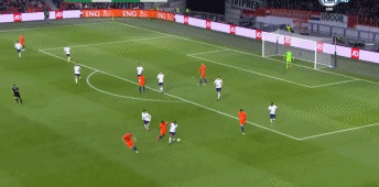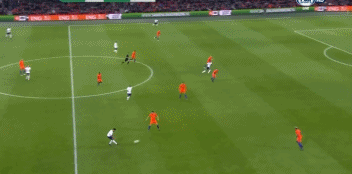 如上图的进攻片段就是荷兰在高位反抢成功,随后打了英格兰措手不及。但由于没有进一步细化进攻思路,急于且盲目的送出传球,导致荷兰此前的逼抢效果减半。此役荷兰的机会并不算少,但最后一传总是无法直击英格兰要害。当然,这也与英格兰防线个人能力非常出众有关。无论斯通斯,还是沃克,都具有出色的身体素质和防守能力。