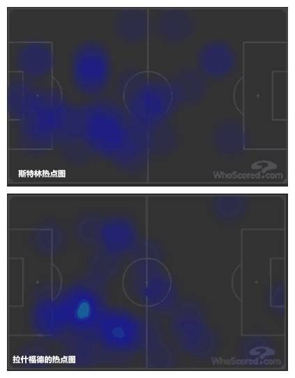 由上图可知,双前锋拉什福德和斯特林此役活动范围很大,不仅局限于禁区,在两个边路都有过多次拿球的机会。事实上,这也是英格兰优于荷兰的地方之一:具备良好的传跑能力和运动能力,对于中前场的衔接作用非常突出。
