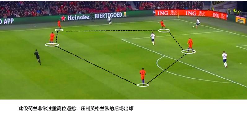 从开场荷兰就坚持在高位压制英格兰出球,封死小球线路,逼迫持球人开大脚送出球权。荷兰依靠大量上下跑动在开场占据了一定主动,英格兰的边路速度优势得到了遏制。
