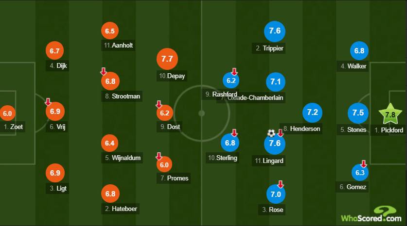荷兰首发:1-佐尔特;4-范迪克、3-德利赫特、6-德弗里(89’19-韦格霍斯特);11-范安霍尔特、8-斯特罗曼(89’15-范德贝克)、5-威纳尔杜姆、2-哈特鲍尔;10-德佩、9-多斯特(66’20-巴贝尔)、7-普罗梅斯(66’18-普罗珀)