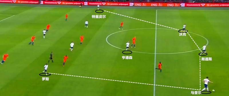 相比荷兰,英格兰的进攻方式更加立体和丰富。如图,英格兰通过穿插跑位在荷兰禁区前沿形成强侧,随后也能精准转移至弱侧插上的队友。虽然没有收获进球,但这就是很明显的两队在进攻能力上的差距。