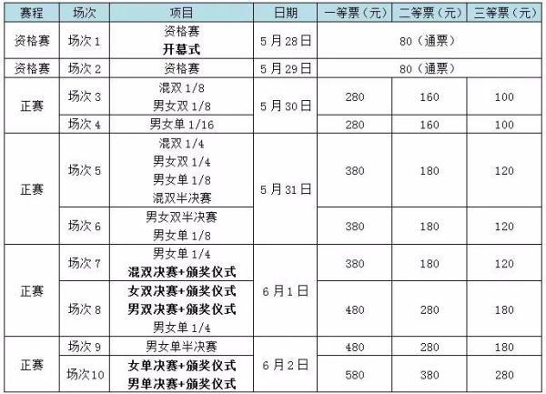 在赛程方面,5月28日-6月2日6天的赛程分为资格赛和正赛,其中5月28日至5月29日为资格赛,5月30日至6月2日为正赛(正赛赛程已在国际乒联官网公布)。根据官方售票网站显示信息,根据比赛日期、场次即位置等不同,单张门票的价格从普通门票80元到580元不等。(详见下表)球迷们可登录大麦体育搜索【2019年中国乒乓球公开赛】即可购票。