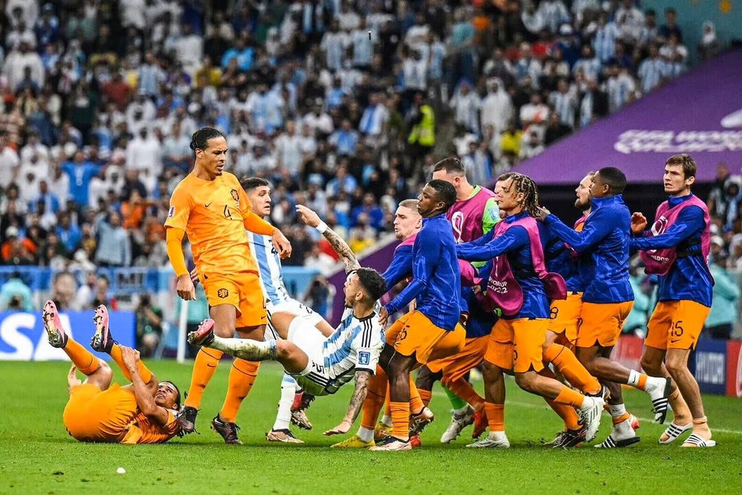 由于求胜心切,其实比赛中两队都火气不小。最激烈的冲突发生在第89分钟,阿根廷队的帕雷德斯在铲人犯规后,还故意将球大力踢向荷兰队替补席,差点引发两队群殴。