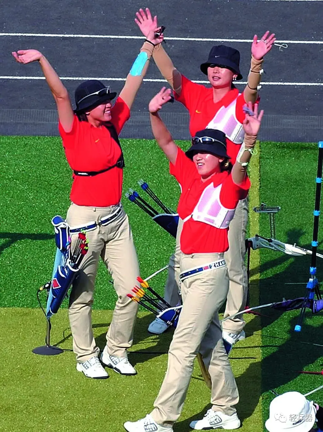 2004年8月20日,中国射箭女队(左起:林桑、张娟娟、何影)在雅典奥运会射箭女子团体决赛中以240比241一环惜败于韩国女队,夺得银牌。图为中国女队在决赛中出场向观众致意