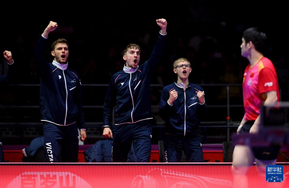 2月25日,法国队在第二盘比赛中庆祝艾利克斯·勒布伦得分。艾利克斯·勒布伦2比3不敌中国队选手樊振东。新华社记者 陶希夷摄