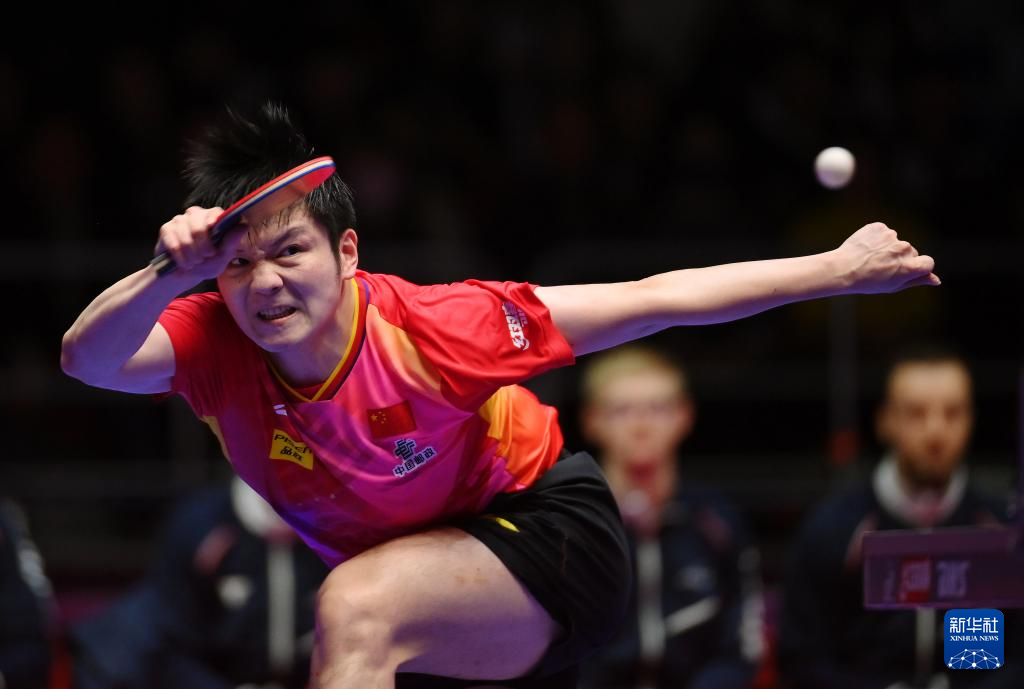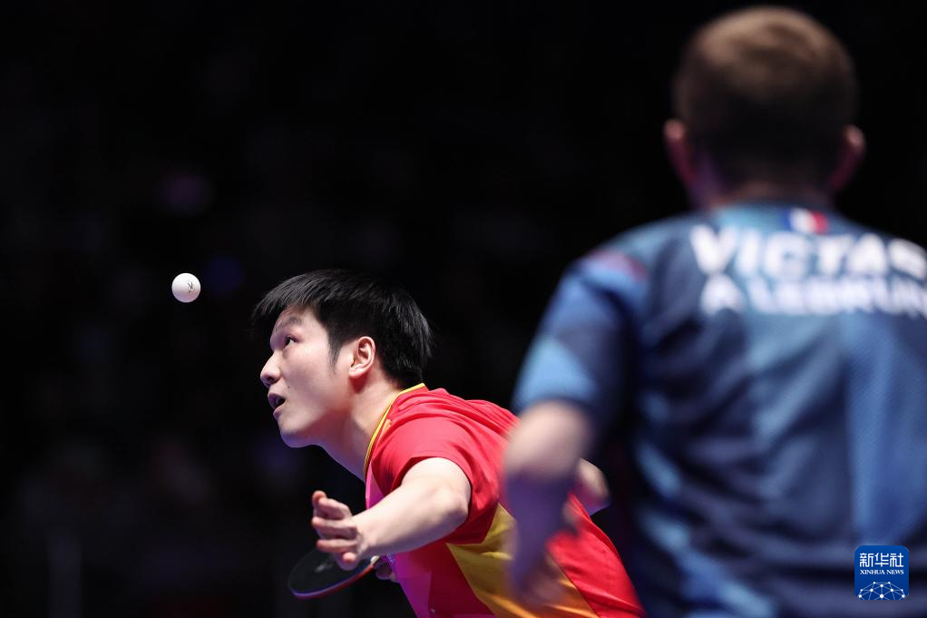 2月25日,中国队选手樊振东在第二盘比赛中回球,他3比2战胜法国队选手艾利克斯·勒布伦。新华社记者 姚琪琳 摄