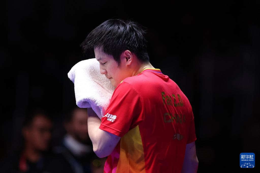 2月25日,中国队选手樊振东在第二盘比赛中擦汗,他3比2战胜法国队选手艾利克斯·勒布伦。新华社记者 杨世尧 摄