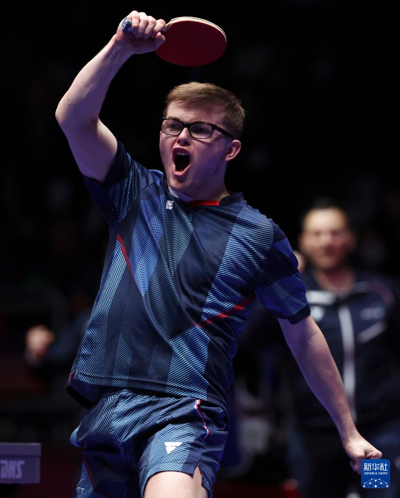 2月25日,法国队选手艾利克斯·勒布伦(左)庆祝第二盘第一局获胜。最终,他2比3不敌中国队选手樊振东。新华社记者 陶希夷摄
