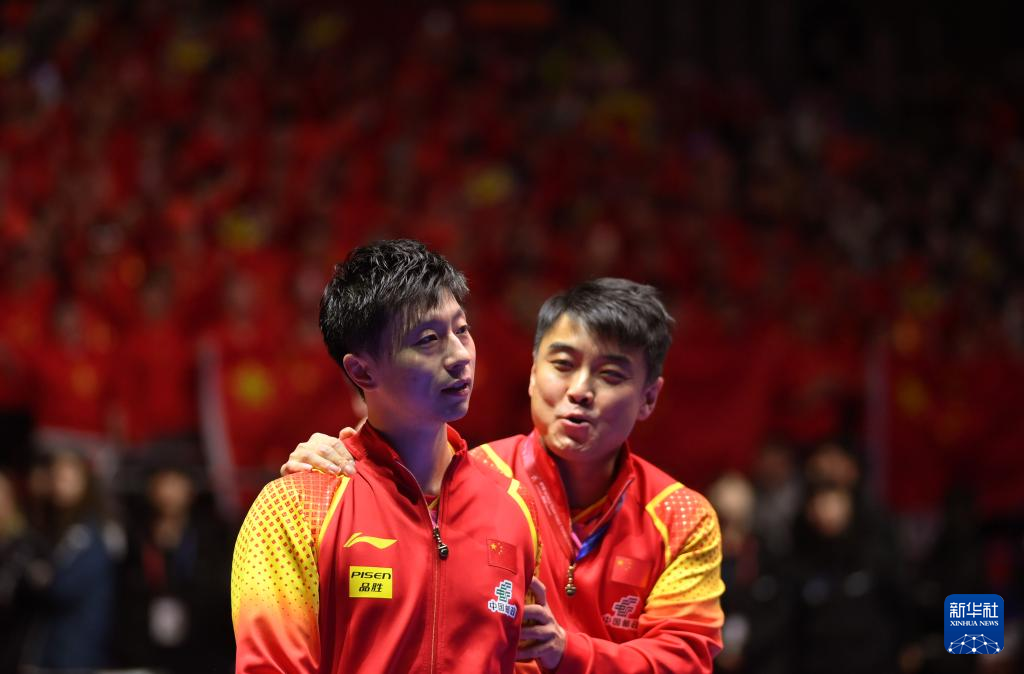 2月25日,中国队教练王皓(右)与选手马龙在夺冠后庆祝。新华社记者 陶希夷 摄