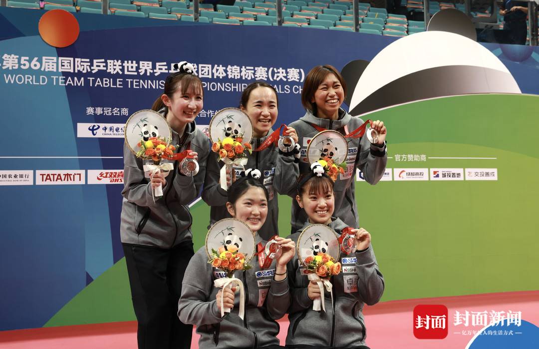 日本女乒队员们自己佩戴了熊猫造型的发箍参加颁奖典礼,开心地与奖牌和获颁的纪念品——一把蜀绣工艺的熊猫团扇拍照