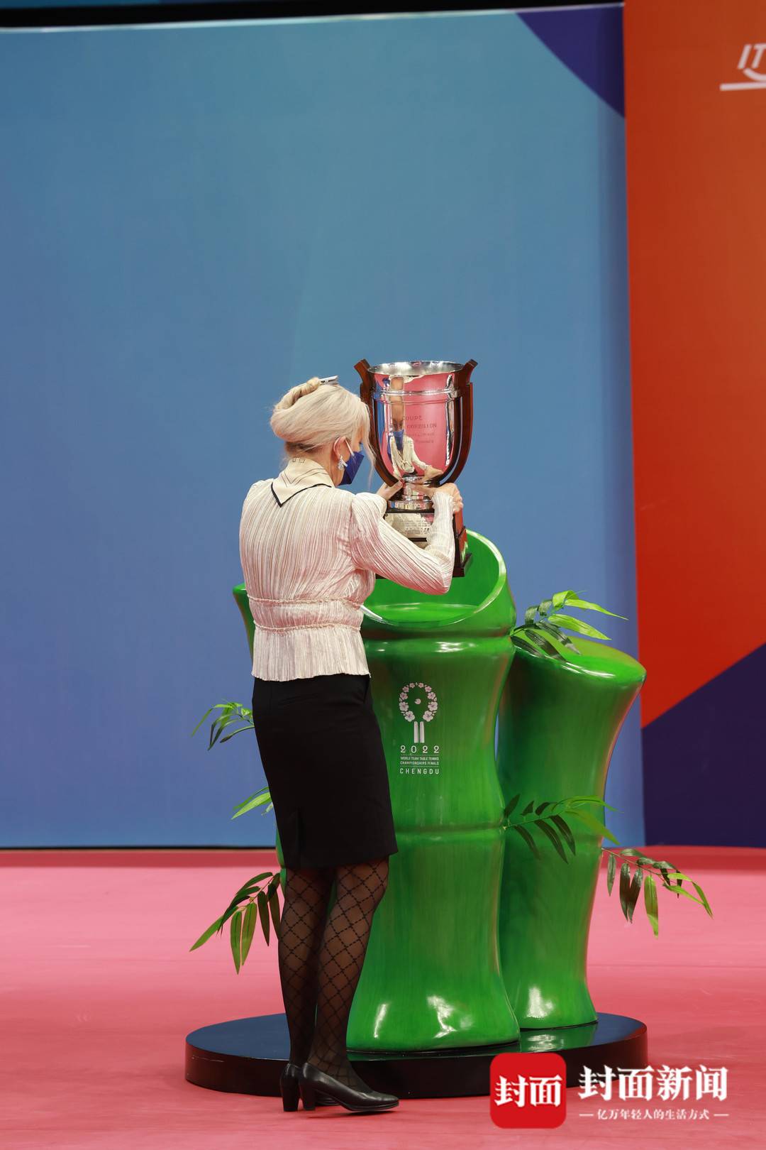中国女乒举起世乒赛女团冠军奖杯—考比伦杯