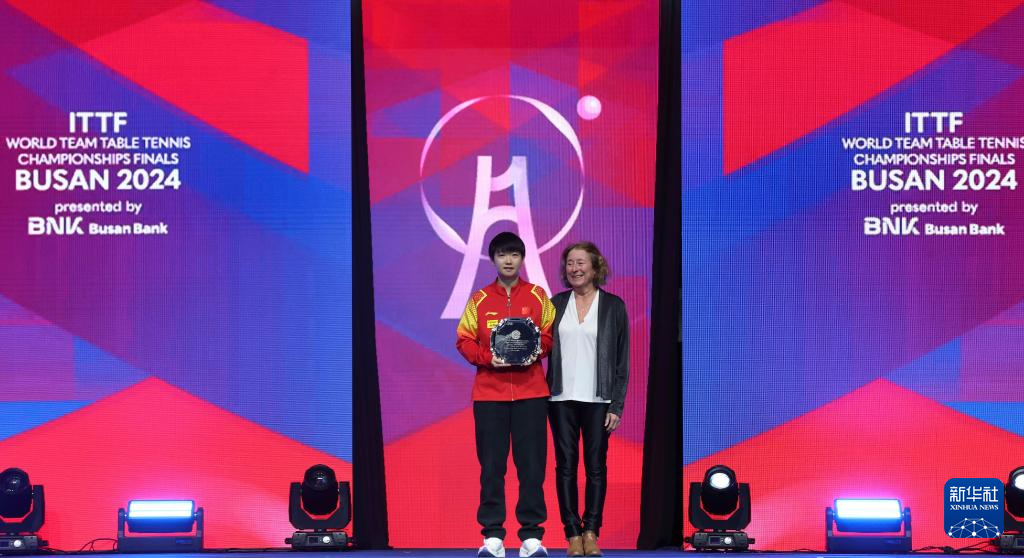 2月25日,孙颖莎(左)被评为本届世乒赛最佳女运动员。新华社记者 姚琪琳 摄
