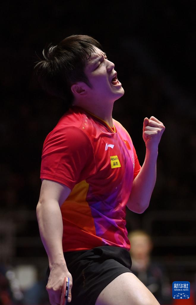 2月25日,中国队选手樊振东庆祝第二盘比赛获胜,他3比2战胜法国队选手艾利克斯·勒布伦。新华社记者 杨世尧 摄