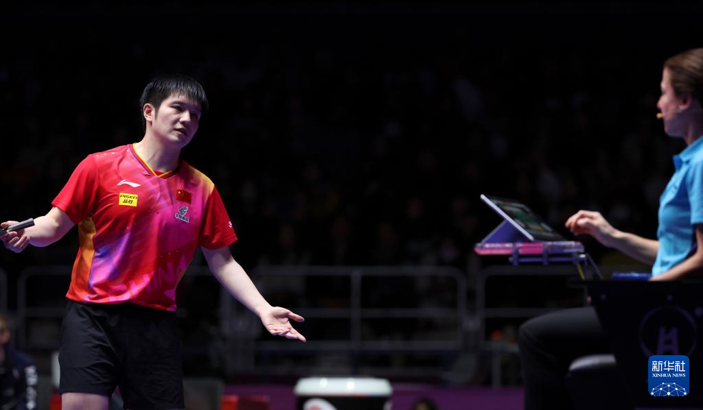 2月25日,樊振东被判罚黄牌后与裁判交流。新华社记者 姚琪琳摄