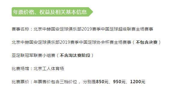 北京时间12月21日,北京中赫国安公布了2019赛季票务公告,年票售价包含三档价位, 分别是850元、950元、1200元。