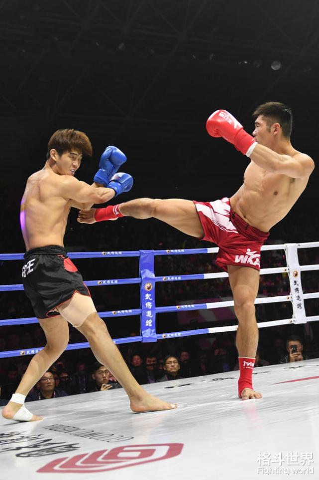 男子90公斤级,中方选手“闽南王”王文忠面对的是2017年世界武术锦标赛金牌获得者、伊朗选手曼格姆。这场大级别比赛,成了新规则的试验场,比赛一开始,王文忠就主动展开进攻,用犀利的膝法展开连续进攻,在第二回合击倒对方一次后,第三回合,王文忠再度重击得手,最终KO获胜。