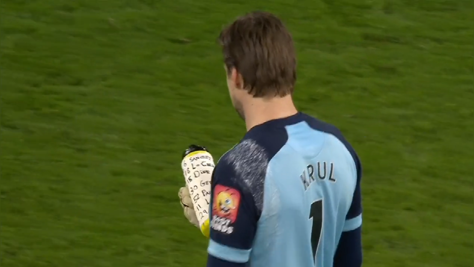 本场比赛,双方由维尔通亨和德尔米奇各进一球,120分钟的时间里战成1比1平,比赛拖入点球大战。点球大战前,诺维奇门将克鲁尔展示了他的水壶,水壶上清晰的依次写着热刺众将的名字,显然是克鲁尔专门为点球大战所作的战前预测准备。