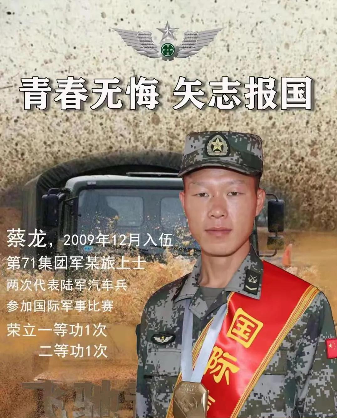 蔡龙,第71集团军某旅上士,两次代表陆军汽车兵赴俄罗斯参加“汽车能手”国际竞赛,两次包揽指挥车驾驶课目全部金牌,两次被俄罗斯国防部评为“最佳车手”。入伍以来,先后荣立一等功1次、二等功1次,被评为“全军优秀士官人才一等奖”“全军红旗车标兵”、陆军“军事训练先进个人”,被河北省聘为“2019年度征兵宣传形象大使”。