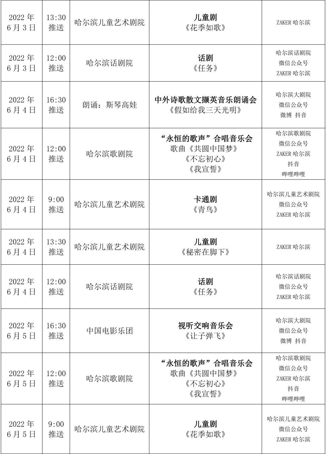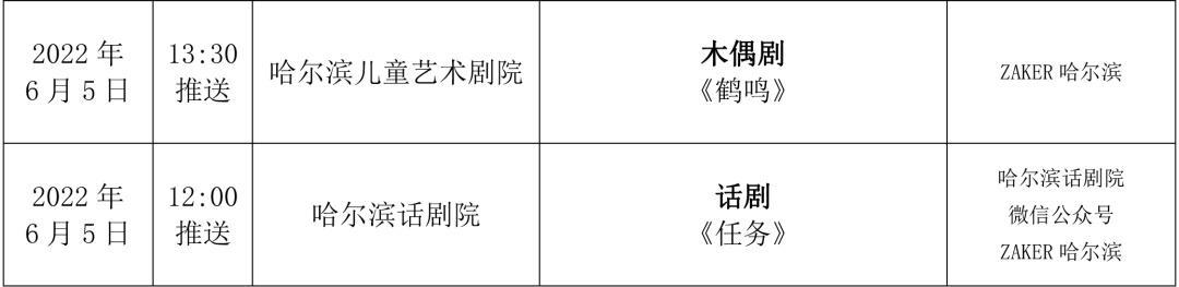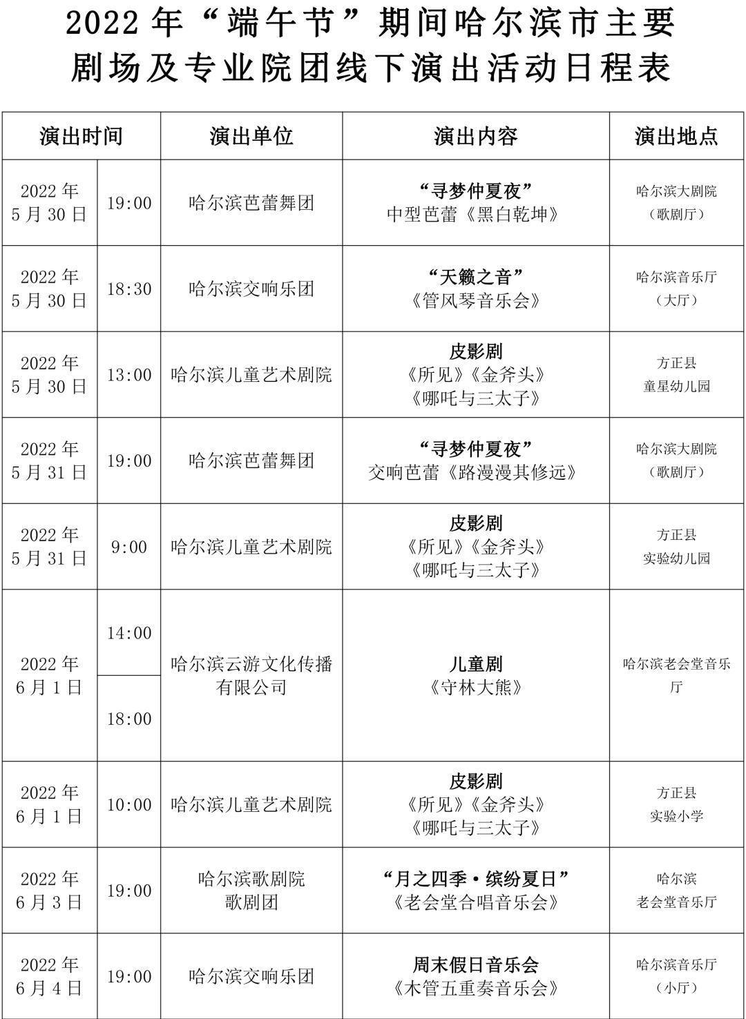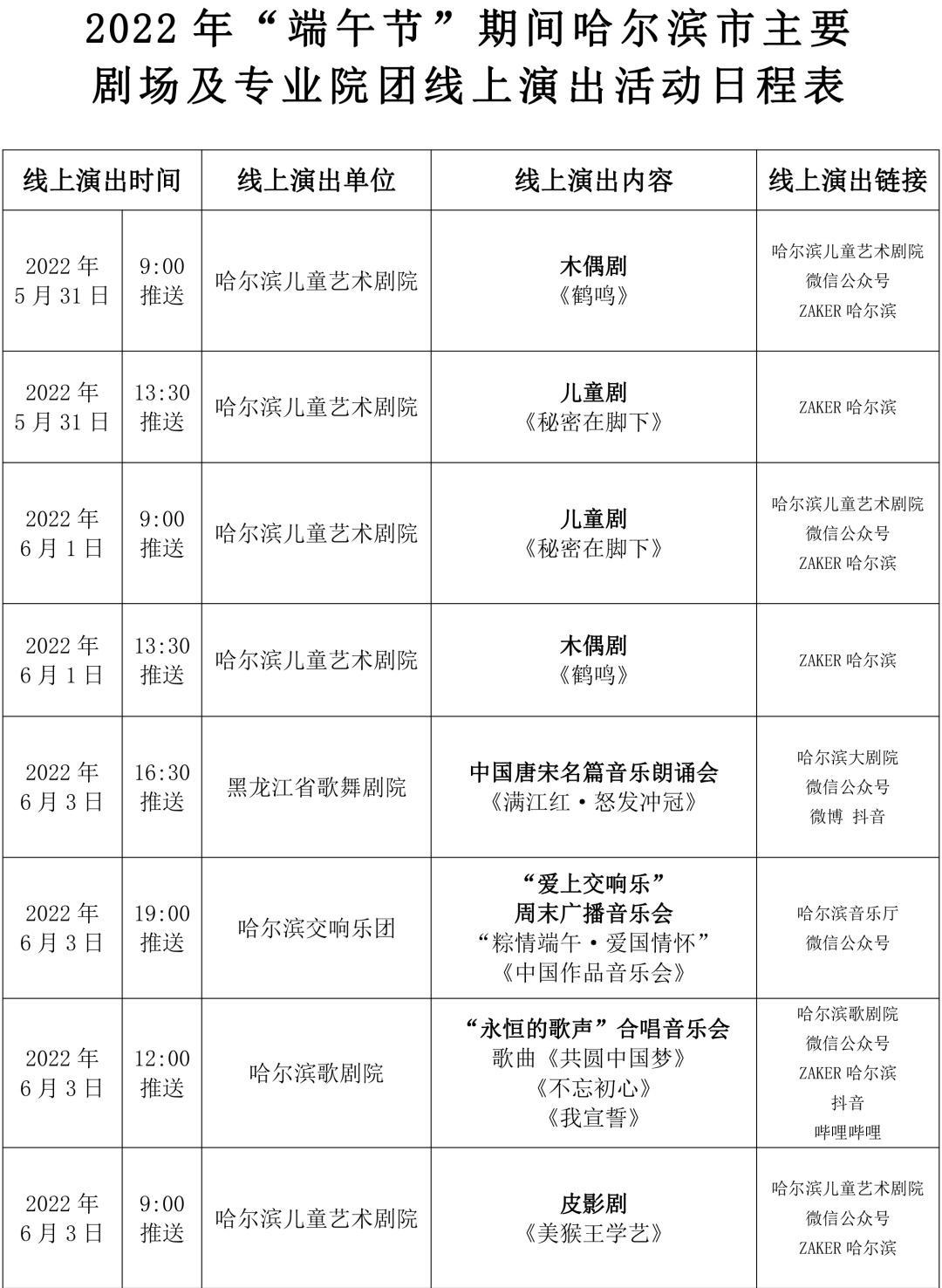 未来几天,儿童节、端午节将陆续来临。5月30日,哈尔滨市文化广电和旅游局公布一周内主要剧场及专业院团线上、线下演出活动日程表,为群众节日艺术之旅提供参考。具体信息如下: