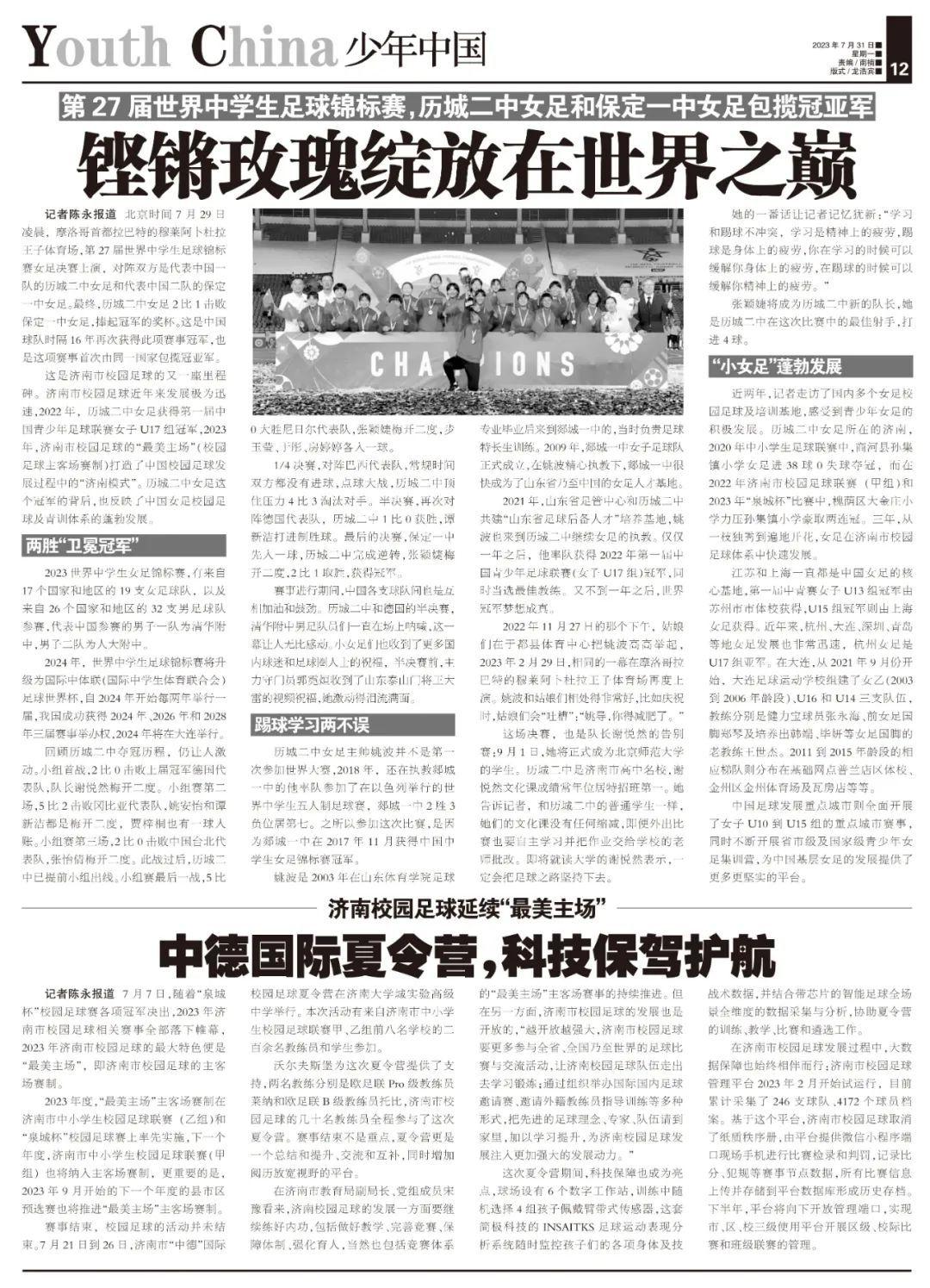 这场决赛,也是队长谢悦然的告别赛:9月1日,她将正式成为北京师范大学的学生。历城二中是济南市高中名校,谢悦然文化课成绩常年位居特招班第一。她告诉记者,和历城二中的普通学生一样,她们的文化课没有任何缩减,即便外出比赛也要自主学习并把作业交给学校的老师批改。即将就读大学的谢悦然表示,一定会把足球之路坚持下去。