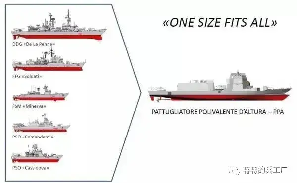 PPA是Pattugliatore Polivalente D'Altura(大型远洋多功能巡逻舰)的简写。他的由来还得追溯到上世纪80年代意大利的一大批中小型巡逻舰。在国家财大气粗时,意大利曾打算一部分退役,一部分交由意大利版FREMM护卫舰来执行巡逻任务。结果在国防预算大减的情况下,FREMM护卫舰显然是不够用了,而指挥官级、仙后座”级、天狼星级、士兵级等5个级别的巡逻舰却在2010年左右急需替换,这种情况下必须用一种新舰艇执行多样化任务。而其还有一个重任,即是地中海巡逻、打击各类走私犯罪和反偷渡非法移民任务,阻止越来越多的非洲人偷渡进入欧洲。这种情况下舰艇吨位自然水涨船高,而且也从单一巡逻任务变成了读作巡逻舰写作护卫舰的存在,并因此划分出不同型别。2015年5月,军备合作联合组织(occar)向芬坎蒂尼和芬梅卡尼卡集团(现为leonardo)授予了一份价值35亿欧元(合38.9亿美元)的多年期合同,建造6艘PPA,另外还有4艘其他船只和1艘后勤支援船,还包括为期10年的综合在役后勤支持。2015年11月,还为第7、8艘PPA船执行了一项合同选择权,使合同总价值增至约54亿欧元(合57.4亿美元)。意大利可能需要16艘各型号PPA来强化海军执行多种任务。